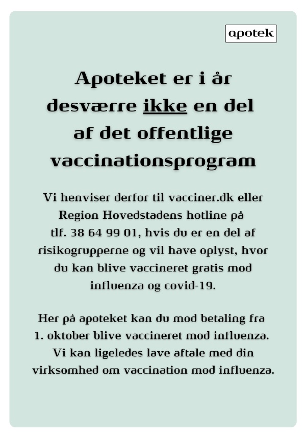 Hos os møder du et veluddannet og serviceminded personale, som vil gøre meget for at sikre dig den bedste behandling, både når det gælder lægeordineret medicin, vaccination og når du handler hos os i øvrigt.