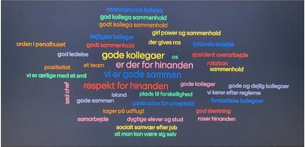 De siger om sig selv: Vi er der for hinanden, vi har respekt for hinanden, vi har et godt sammenhold, her er plads til forskellighed, vi anerkender og roser hinanden, socialt samvær efter job og retfærdighed.